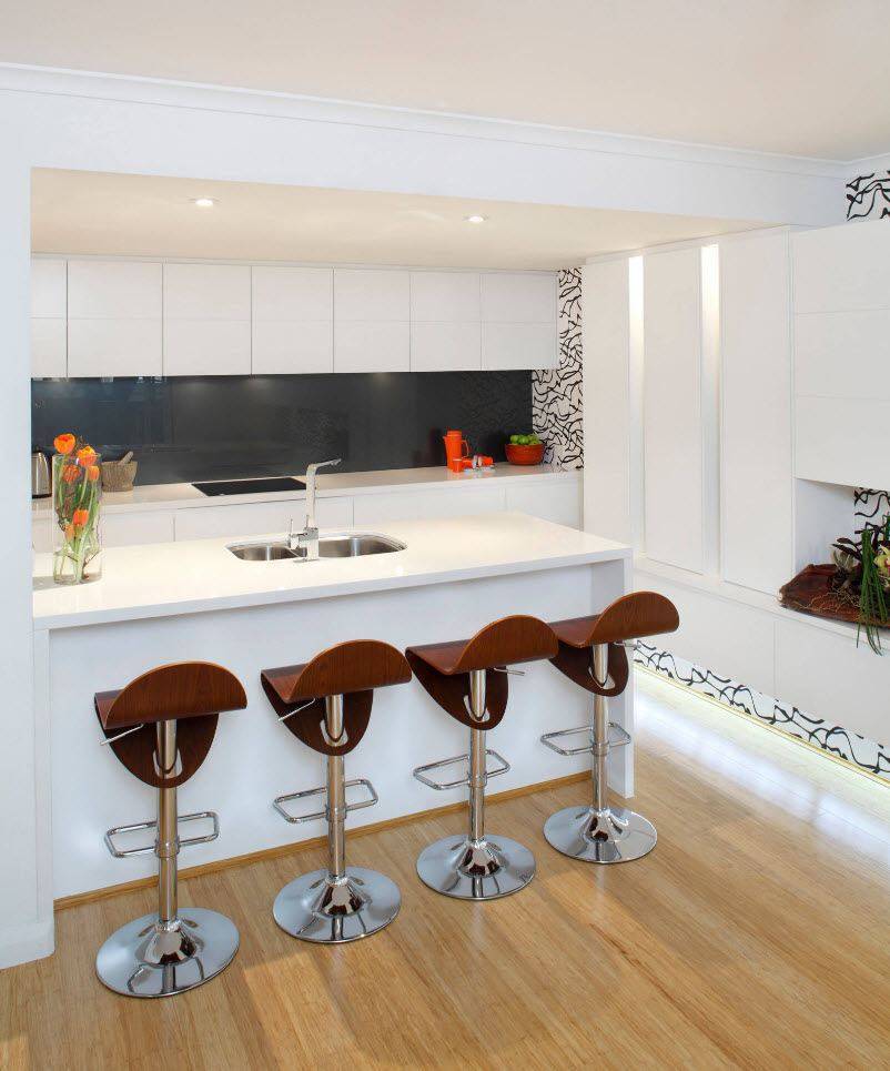 Несмотря на то, что в интерьерах кухни куда реже встречается это оформление, а обои с бело-черной расцветкой для кухонной комнаты могут стать современным и стильным решением для всех, кто обожает простоту и универсальность. Но, как и в остальных комнатах, для кухни выбор данных монохромных вариантов потребует отдельного внимания. Вам стоит продумать все детали, а также продумать сочетания цветов штор и обоев, пола, предметов мебели. Для узких комнат черные обои стоит приклеивать вдоль коротких стен, а белые вдоль длинных. Так вам удастся зрительно исправлять и подкорректировать форму комнату, делая ее более квадратной.