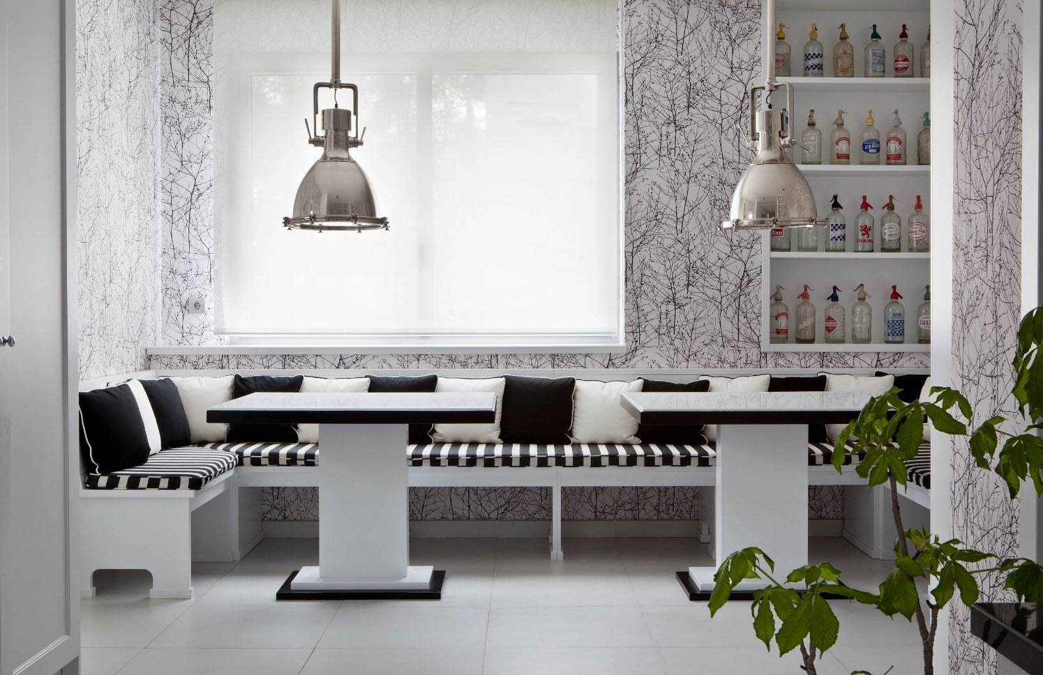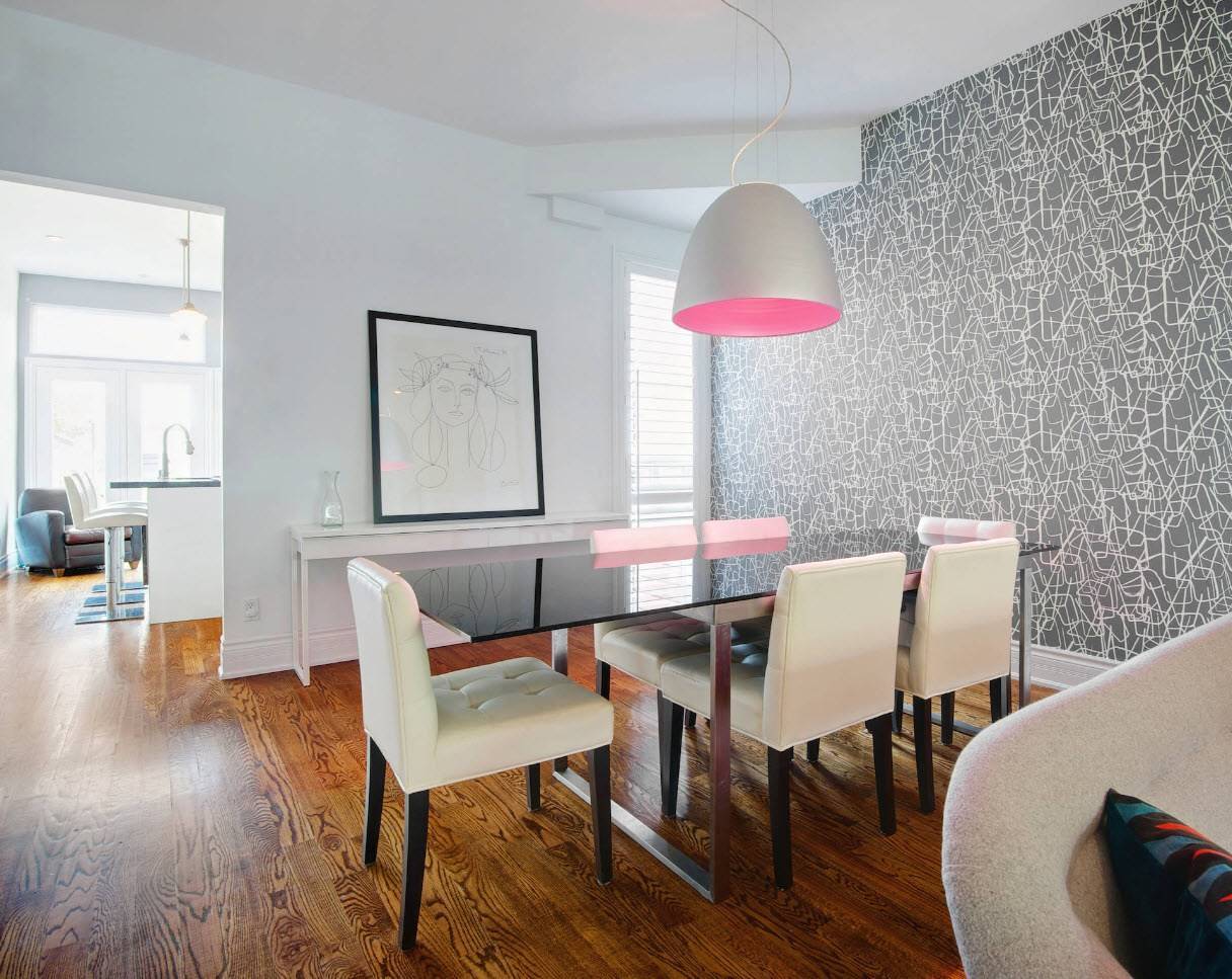 Стоит помнить о том, что именно в кухонном интерьере черно-белые обои иногда выглядят немного скучно, а потому постарайтесь добавить какие-то яркие цвета – бра или люстру в контрастном, ярком цвете. Еще на фоне таких обоев можно привнести изюминку и облагородить кухонную комнату при помощи стеклянного стола