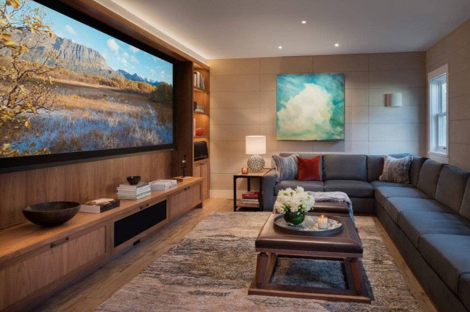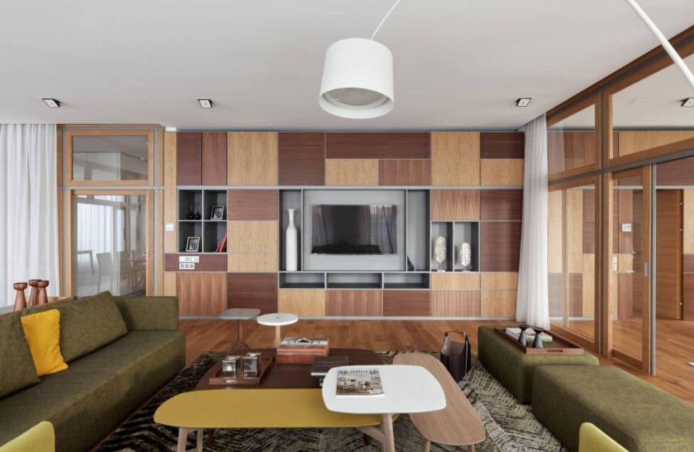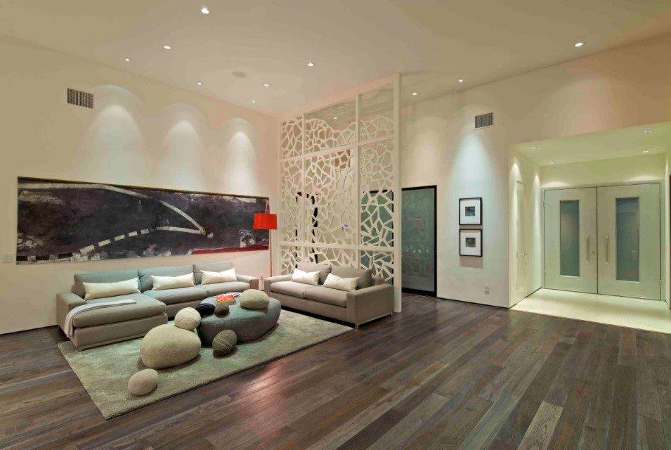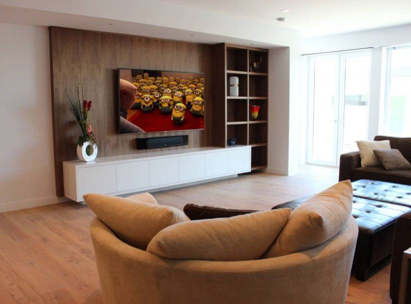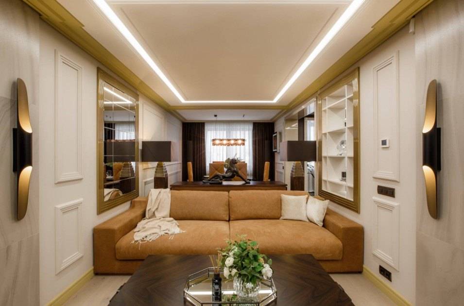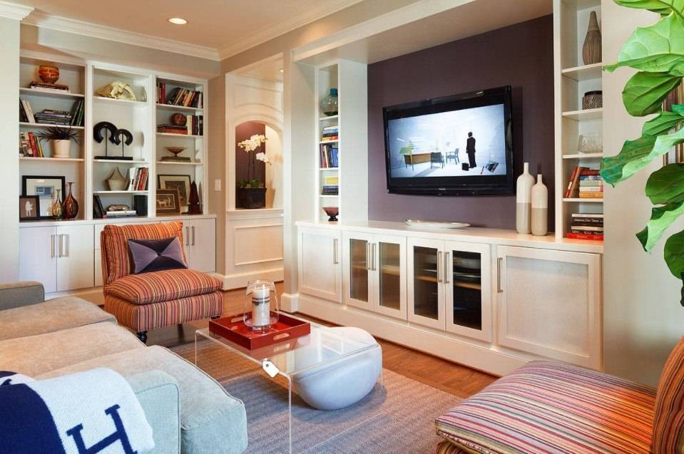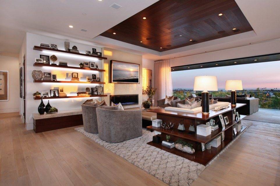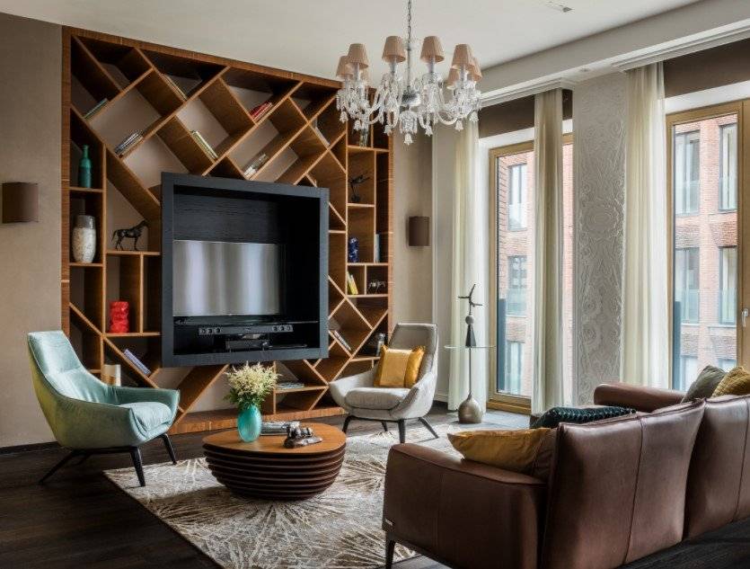 Интерьер гостиной хорошо сочетает в себе полки, ниши, гипсокартонные конструкции.