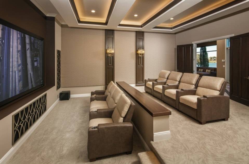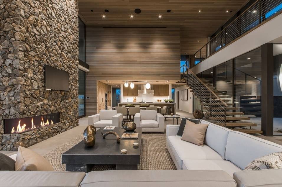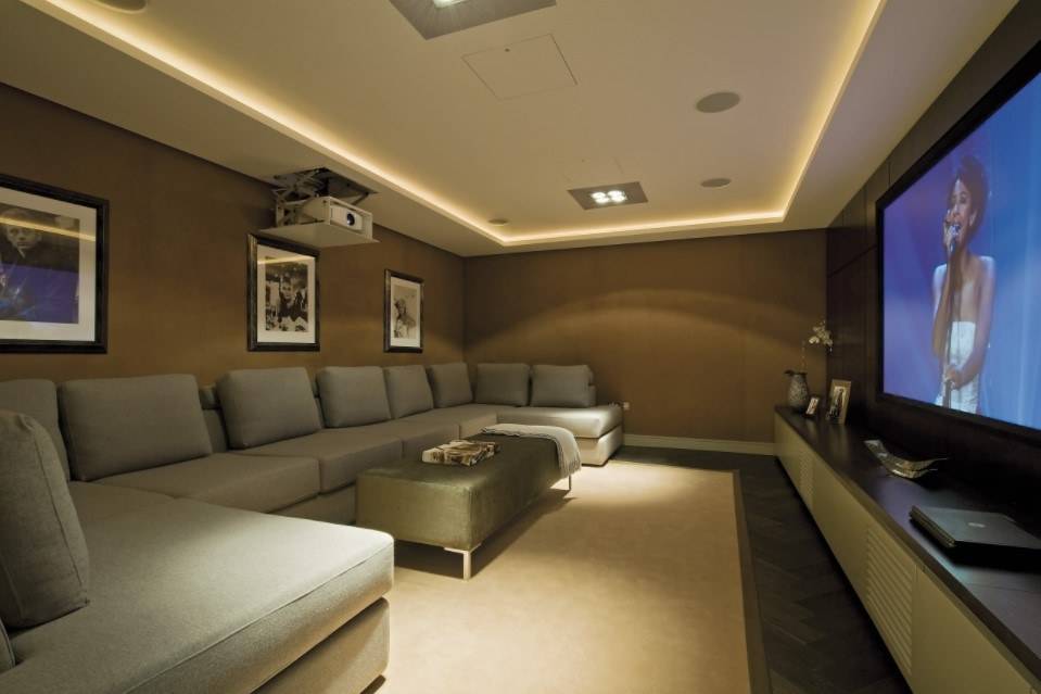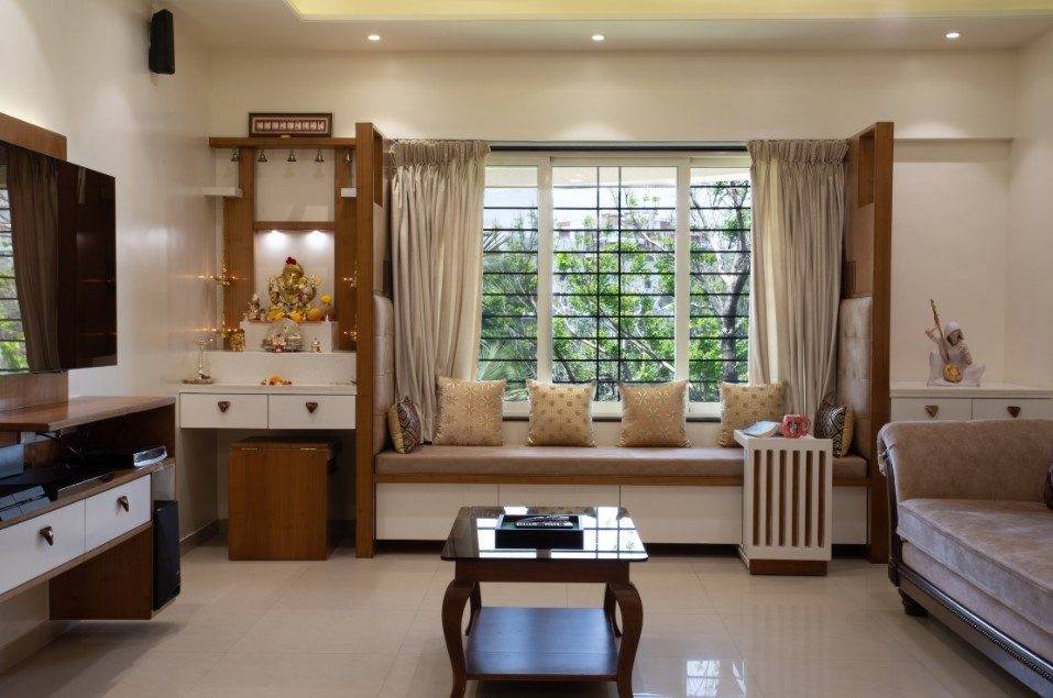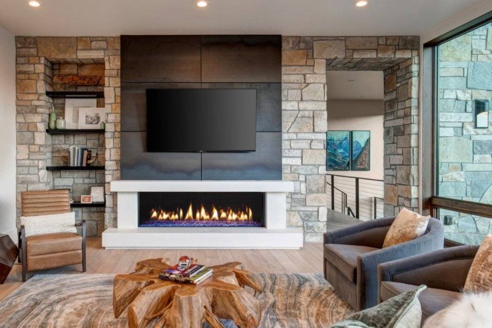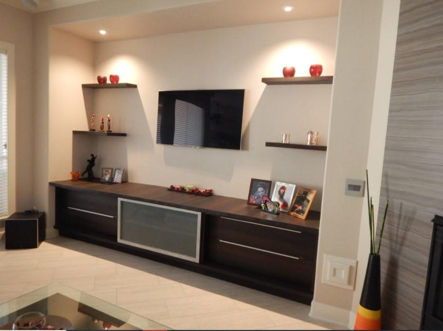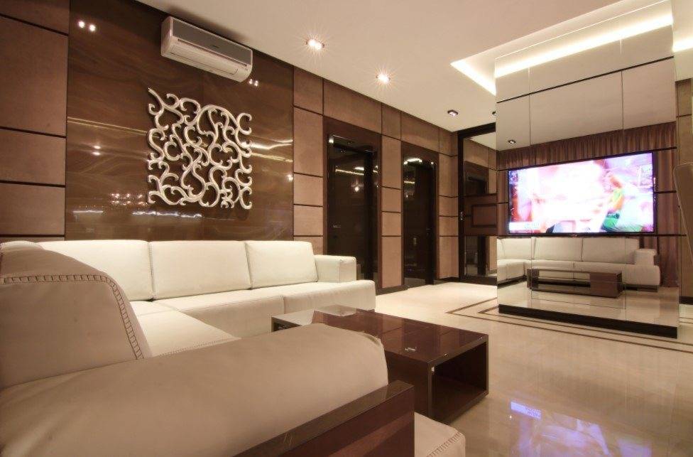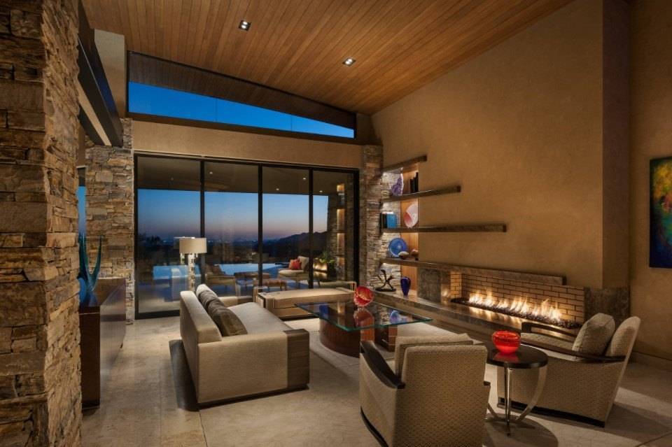 Интерьер гостиной хорошо сочетает в себе полки, ниши, гипсокартонные конструкции.