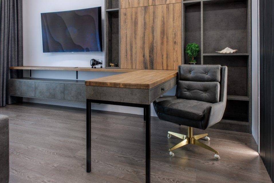 Серый прекрасно подчёркивает выразительность и фактуру древесного оттенка.
