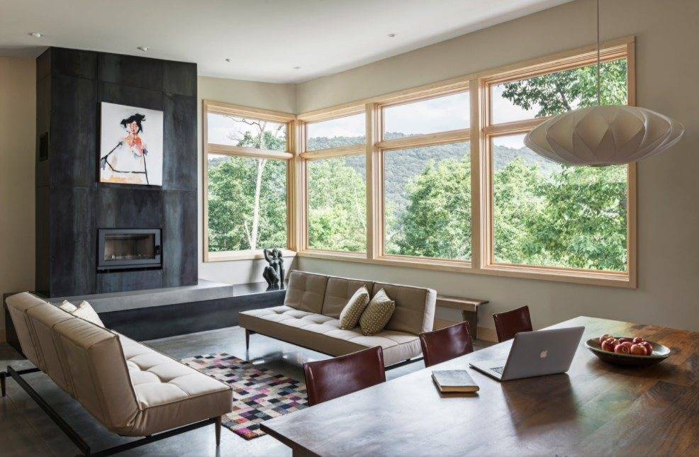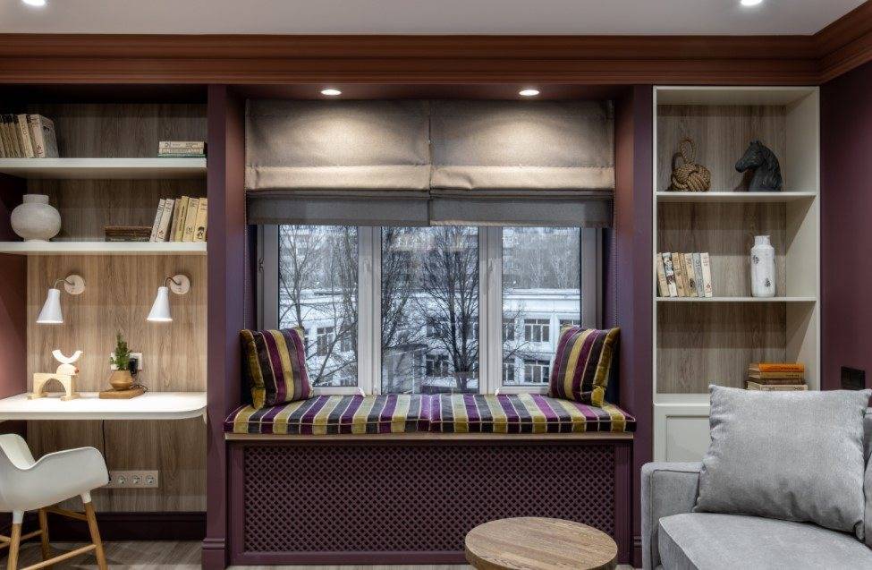 Такое решение позволит акцентировать внимание на геометрии окна и скорректировать форму комнаты. Дополнительные манипуляции с теми же шторами и декоративными элементами открывают путь к изменению стилистики