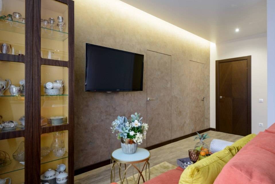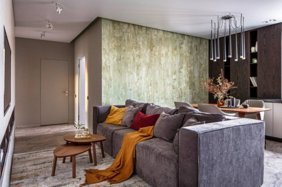 Можно добавить декоративную штукатурку на стенах или обои с пастельным рисунком в гостиную комнату.