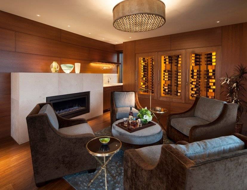 Как вы уже догадались цвет венге достаточно глубокий и выразительный оттенок, поэтому использовать его в оформлении гостиной нужно правильно. Оттенять тёмный венге следует при помощи светлой обстановки, а помимо основного источника освещения использовать настенные бра и дополнительную подсветку в виде точечных светильников.
