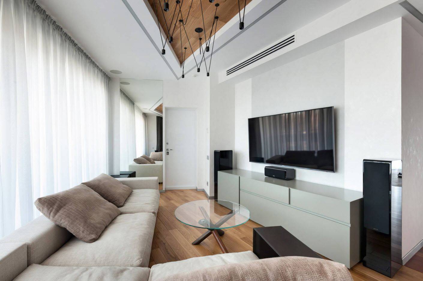 Белый зал — это не только стены и диван в таком цвете. Комната может быть разработана с использованием различных материалов в оттенках белого. Играя текстурами и тканями помещению визуально дополняется площадь измерения, а характер становится интереснее. Пол, выложенный плиткой, окрашенный в белый цвет, отлично сочетается с серым ковром и бежевым диваном. Белая стена — это лишь фон для общего декора комнаты. На потолке могут быть деревянные панели в естественном тоне. Белизна видна также и в выборе текстиля, включая занавески.