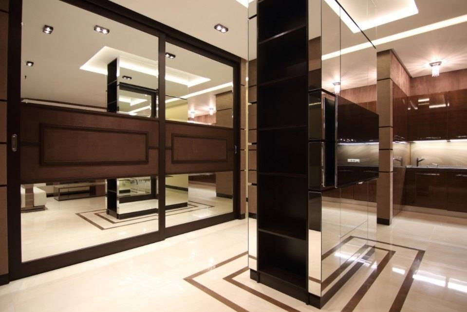 Прихожая – самое малогабаритное помещение во всем доме. Простая, безыскусная отделка, дополненная мебелью: шкафами для верхней одежды, вешалкой, тумбочкой или трюмо для бытовых мелочей. Интерьер здесь должен быть преддверием квартиры в целом, поэтому цветовую гамму и стилистику оформления лучше подобрать сообразно следующему за холлом помещению. Немного расширить пространство поможет зеркало в пол, заключенное в коричневую раму.