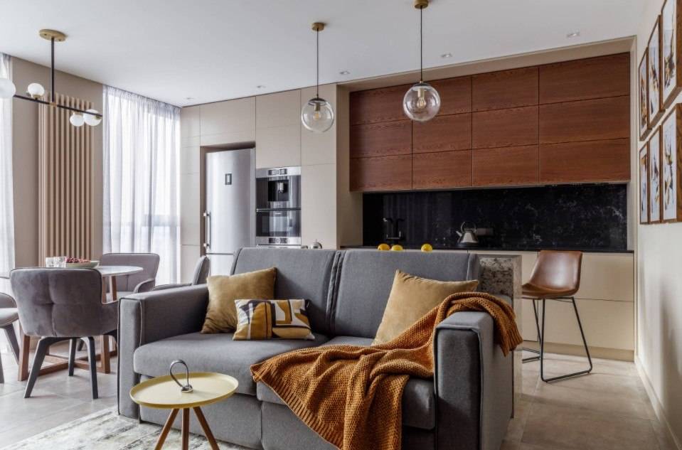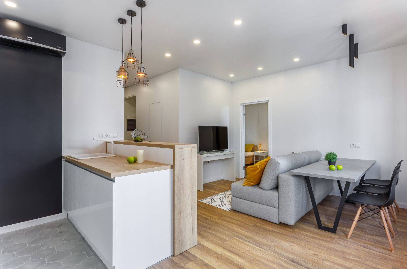 Еще одна интересная идея — сочетание белого и серого. Аксессуары и мебель этого цвета отлично смотрятся в гостиной-кухне, где преобладающим оттенком является белый. Это великолепная комбинация для небольших пространств. На самом деле, комната может быть даже очень маленькой, но белый на стенах, а также на мебели придаст гостиной-кухне дополнительное измерение.