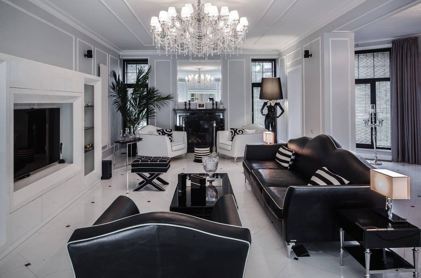 Классическое сочетание белого и черного — один из самых очевидных вариантов, когда дело доходит до дизайна интерьера. Современные дизайнеры не противники такого направления, но считают, что иногда он может придать комнате скучный, штамповый, а в крайних случаях дешевый характер. Белая мебель и стены контрастируют черной мебелью и текстилем. То, что придает интерьеру стильный и модный характер, это окна, которые выдержаны в черно-белой цветовой гамме. Декоративные аксессуары, такие как люстра или подушки, дополнят образ этой модной гостиной.