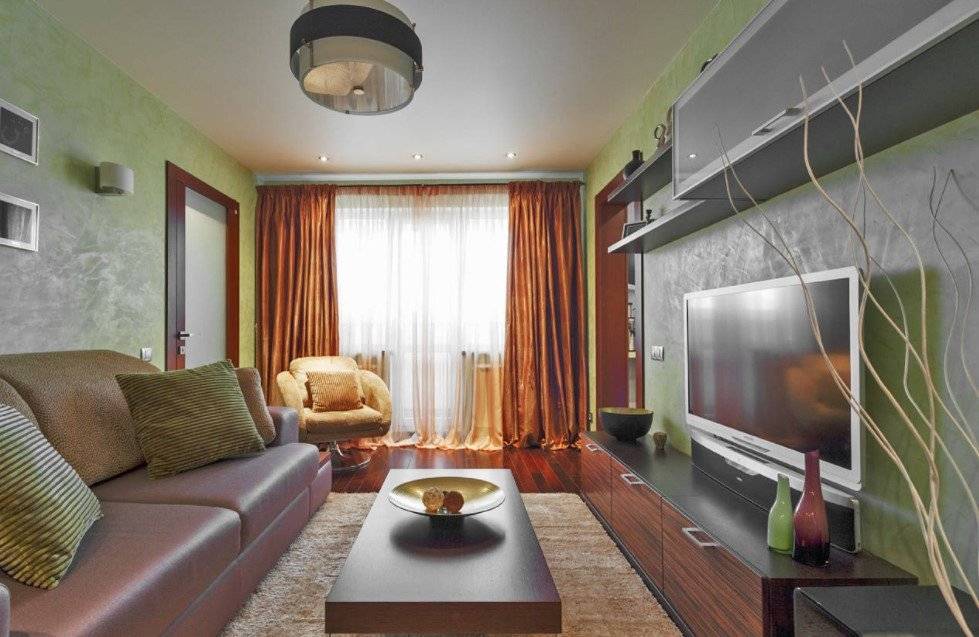 Избегайте негабаритной мебели и тяжелых штор. Текстиль, используемый в маленькой гостиной, должен быть светлым и воздушным, желательно на 2-3 тона темнее, чем основной цвет помещения.