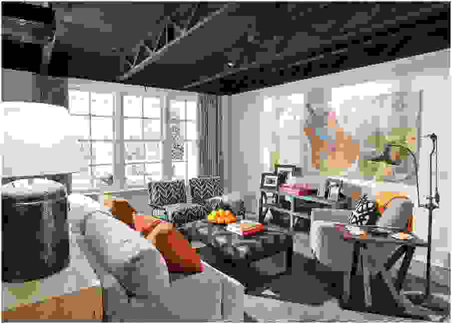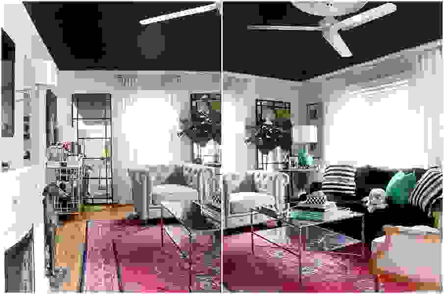 Чёрный потолок совершенно не портит атмосферу уютной гостиной