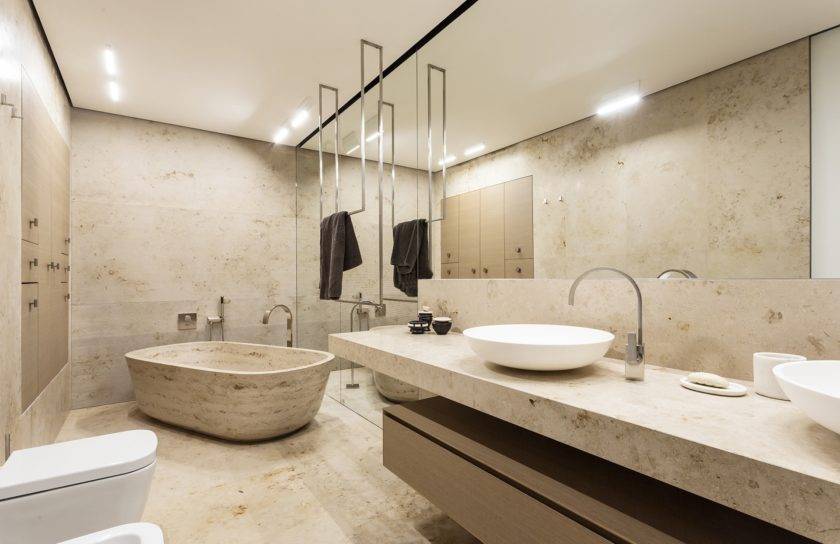 Бетон подходит для большинства помещений, поэтому стены из него применяются как в ванной, так и на кухне