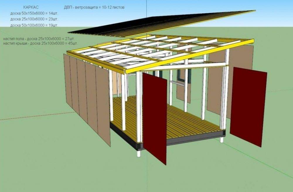 Дальше обшивают каркас, вставляют рамы в оконные проемы и устанавливают дверь. Постройку отделывают краской и приступают к оформлению внутреннего пространства: делают полки, проводят электричество.