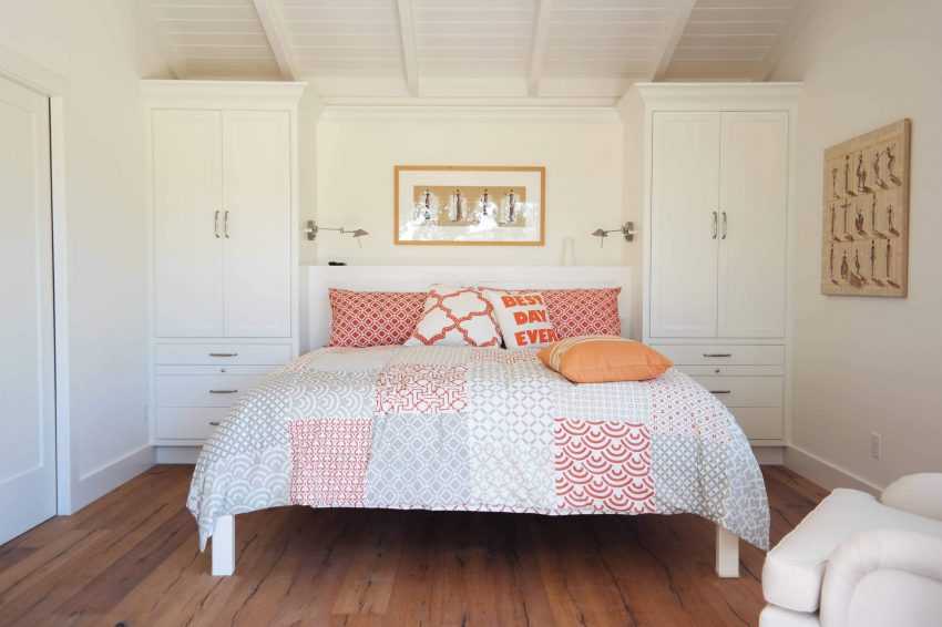 Что касается других характеристик, таких, как цвет, размеры, форма навесных шкафов, то исходить следует из дизайна интерьера и подбирать мебель так, чтобы кровать под ними и окружающие детали (например, обои на соседней стене) смотрелись гармонично. Прямоугольные и квадратные шкафы — удел классических или минималистичных интерьеров, но, в то же время, они очень удобны в использовании и уходе. А вот наполнение шкафов в виде домиков, трапеций, арок придется тщательно продумать, чтобы внутри не пропадало неиспользуемое пространство.