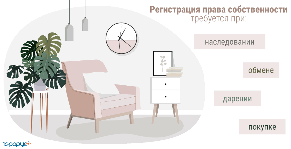 Самые распространенные случаи, когда требуется регистрация права собственности на квартиру: покупка (ст. 551, 558 ГК РФ), мена (обмен) (ст. 567 ГК РФ), дарение (п. 3 ст. 574 ГК РФ), наследование. В этих случаях совершается государственная регистрация и самой сделки, и прав по этой сделке.