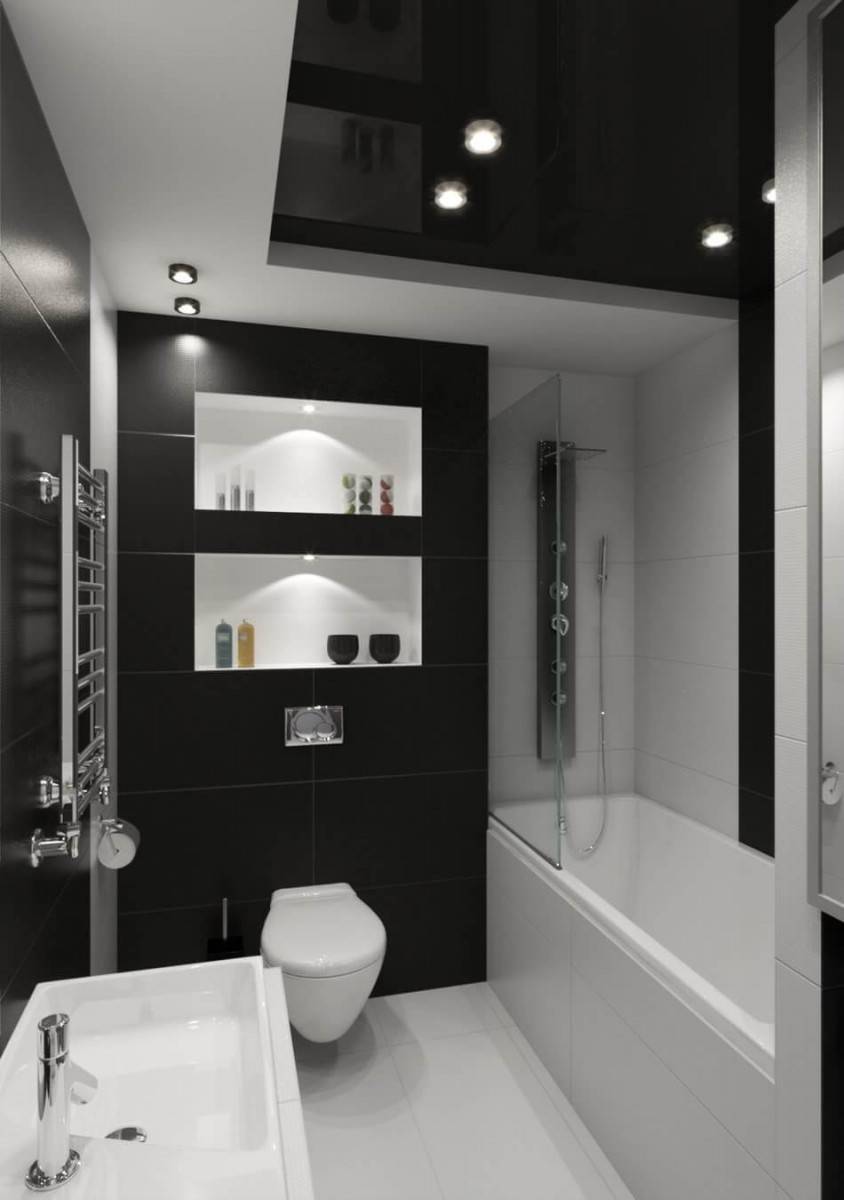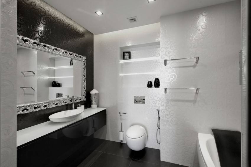 Особое внимание следует уделить подбору осветительных приборов. Обычно ванные комнаты не имеют источников естественного освещения, а используемые в интерьере черные тона требуют много света