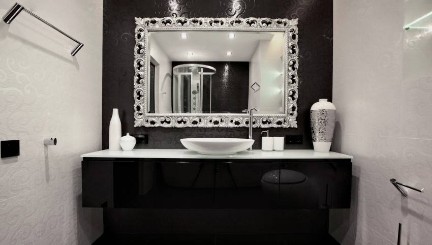 Зеркала в ванную классического стиля обрамляют в багет с богатой резьбой и позолотой. Они считаются одной из главных декоративных «изюминок». Альтернативой служат зеркала, занимающие всю стену над умывальником, по обеим сторонам которых располагаются полки или вертикальные пеналы.