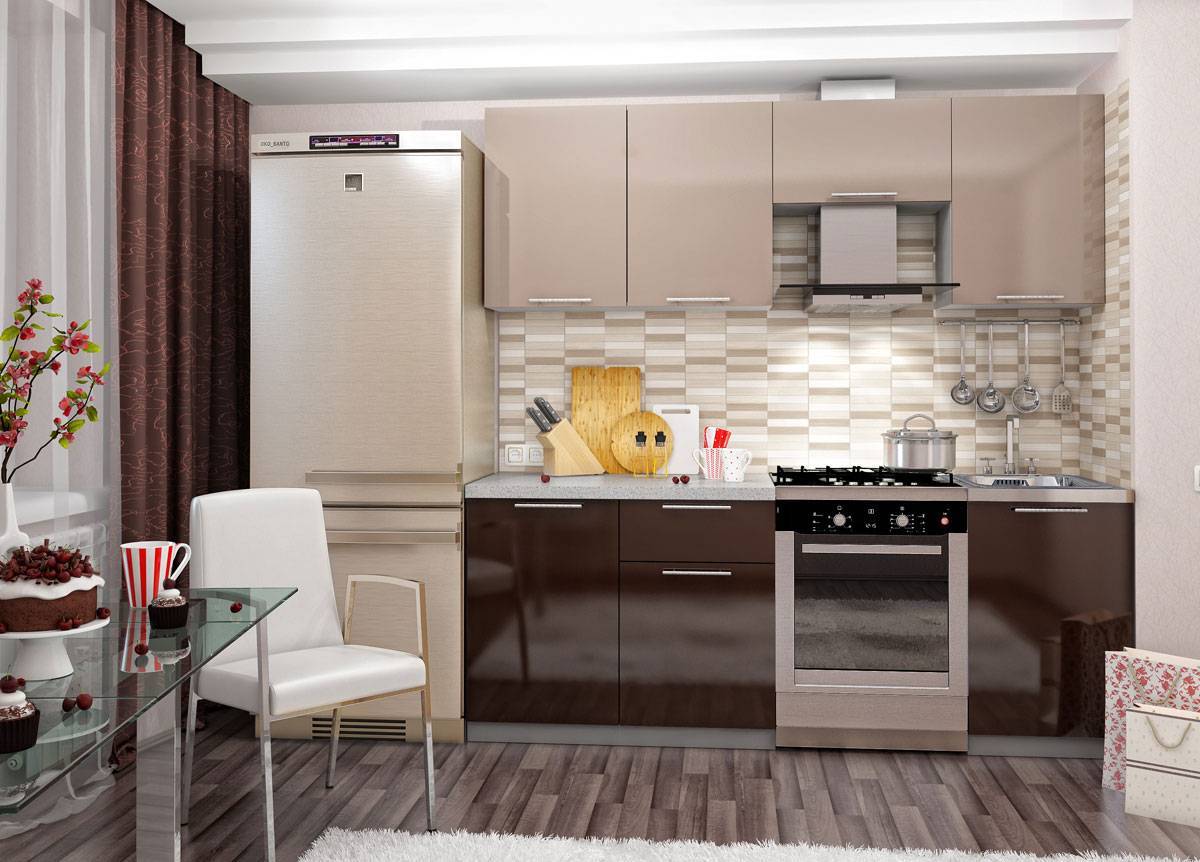 Линейное. Используется в кухнях площадью 6-10 кв.м. Холодильник, плита и мойка размещаются вдоль одной стены. Обеденная зона располагается напротив и представлена барной стойкой или откидной столешницей;