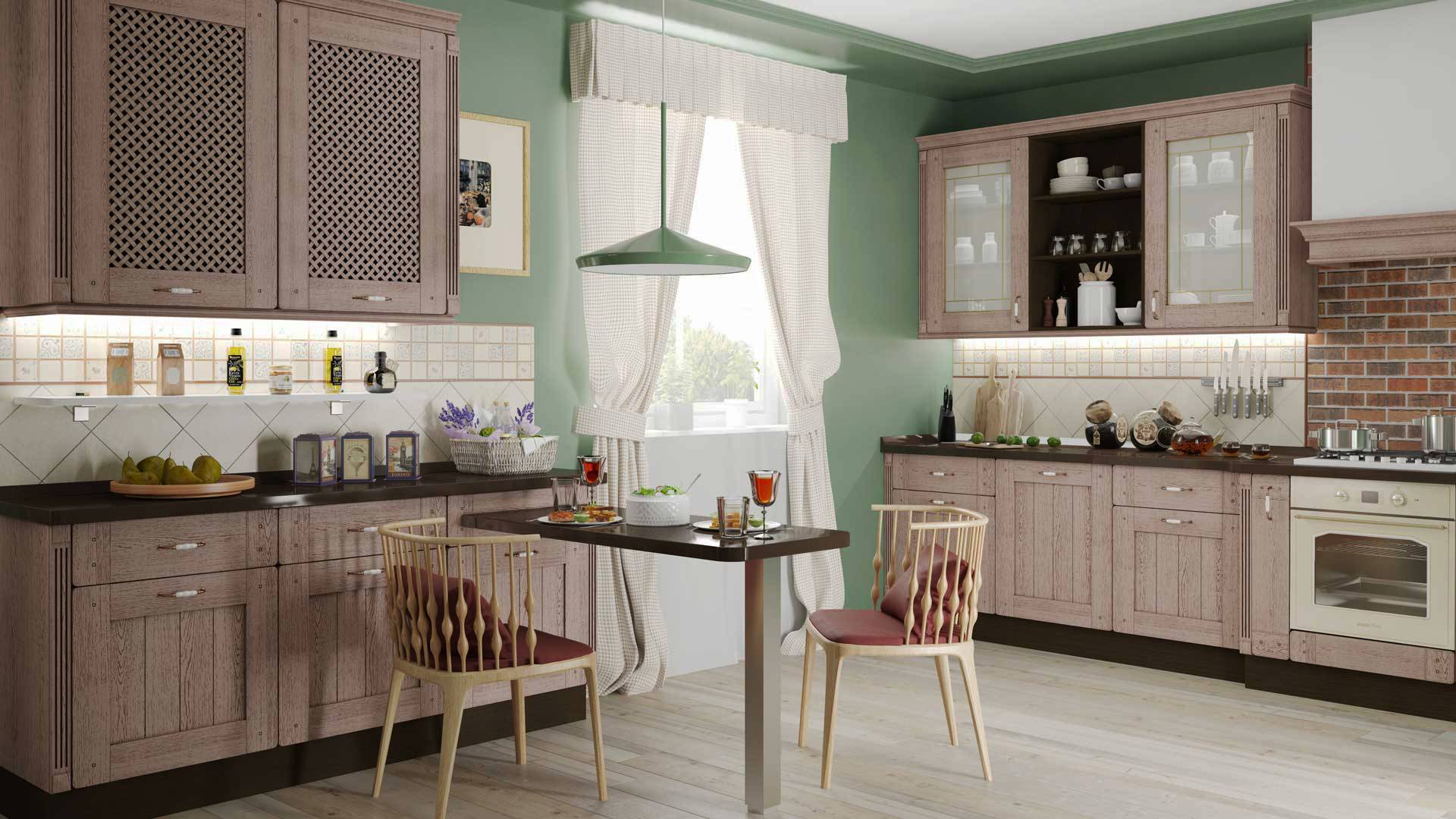 - Капучино может иметь идеальное сочетание с несколькими оттенками зеленого одновременно. Например, фартук на фоне фасада можно сделать фисташковым. Напольное покрытие стараются делать более затемненным, матовым.