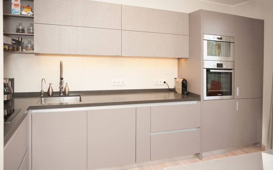 Капучино в отделке гарнитура для кухни — универсальный тон, позволяющий сделать интерьер холодным и современным или нежным десертным. В сочетании с белым и серым он приобретает необходимую сдержанность.