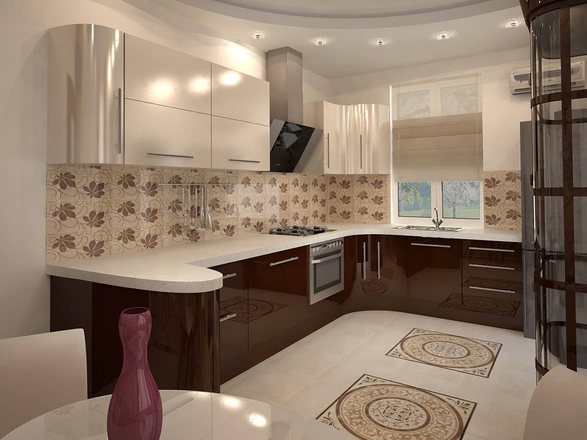 Стиль маленькой кухни в кофейном оттенке привлекает внимание. Молочно-бежевый фасад отлично сочетается с кафелем, имеющим интересный орнамент на полу