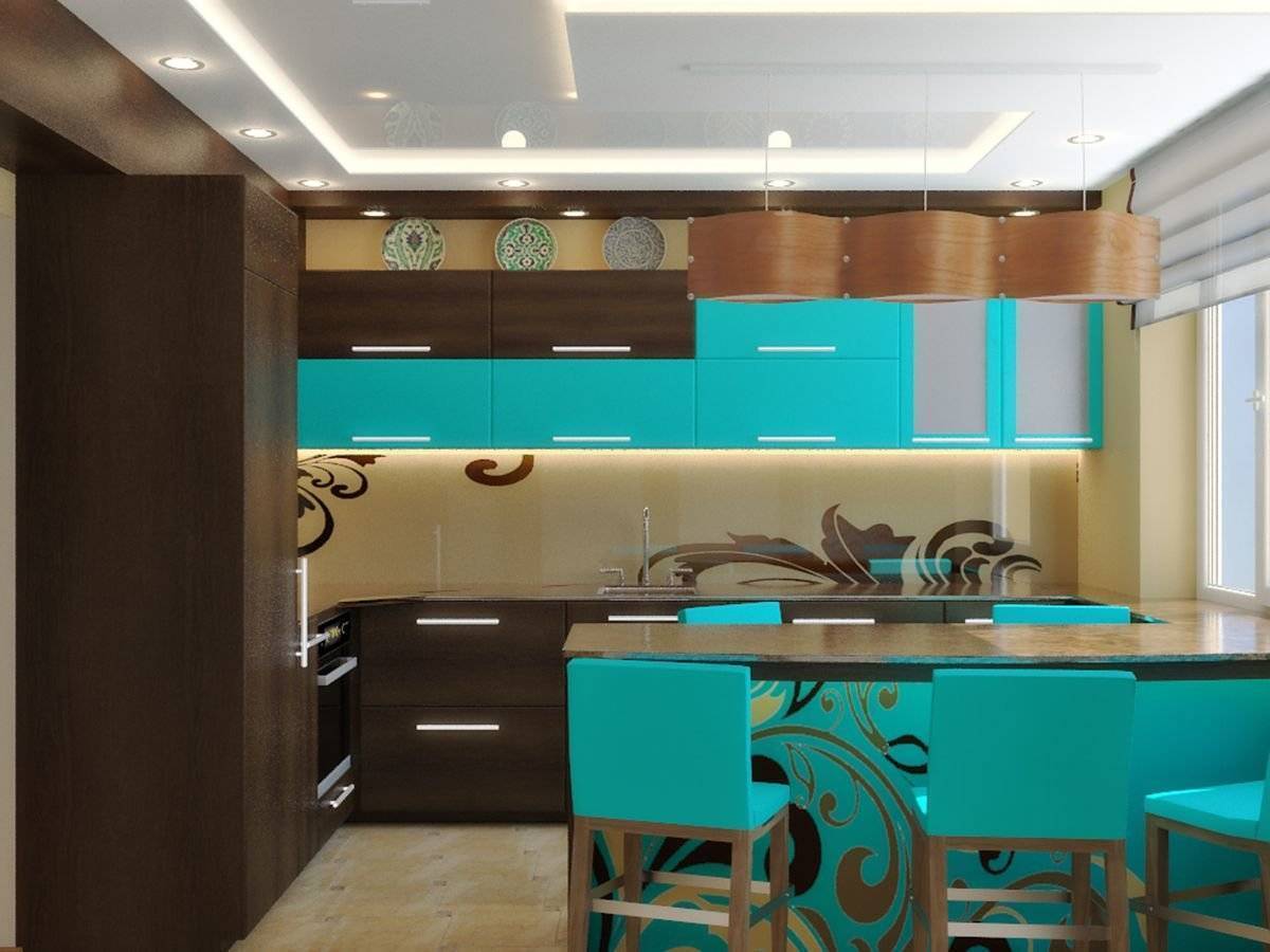 Г-образное или угловое. Самый распространенный способ расположения, так как образуется удобный, эргономичный рабочий треугольник. В углах оборудуют системы хранения. Часто в квадратной кухне устанавливают барную стойку, как продолжение столешницы;
