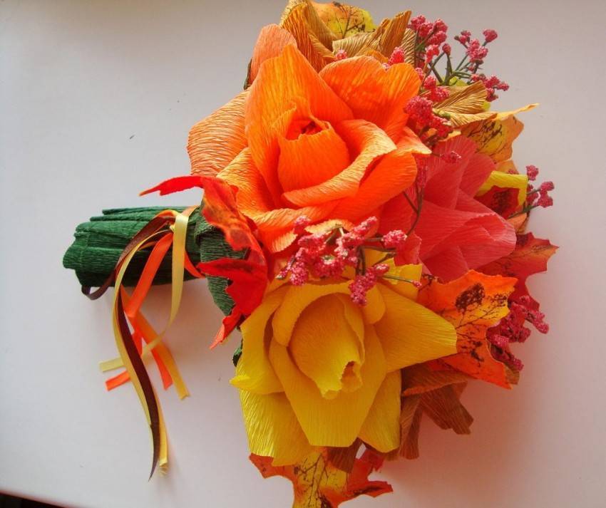 Если под рукой не оказалось гофрированной бумаги, то в ход пускают листы старых глянцевых журналов. Выбирается подходящая расцветка и цветок собирается по выбранной технологии. Такие флористические шедевры легки в исполнении, практически не имеют затрат и красивы в результате.