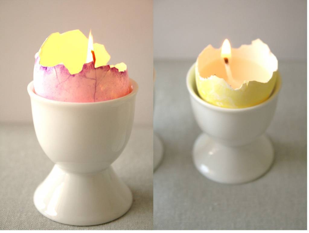 Подставка для яйца может стать прекрасным подсвечником на праздничном столе, если дополнить ее воском и фитилем, которые будут размещаться в скорлупе.