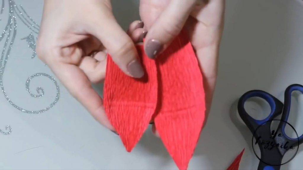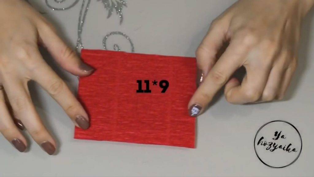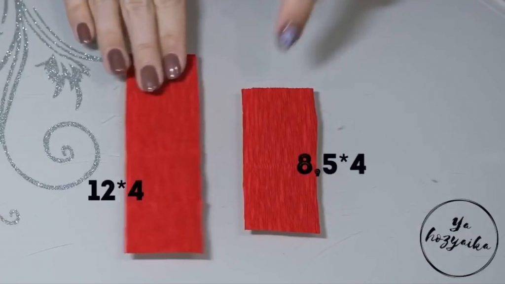 - Красную гофробумагу нарезать 7,5/8,5 см. Зеленную – 5/7,5. Число зависит от желаемого размера букета.