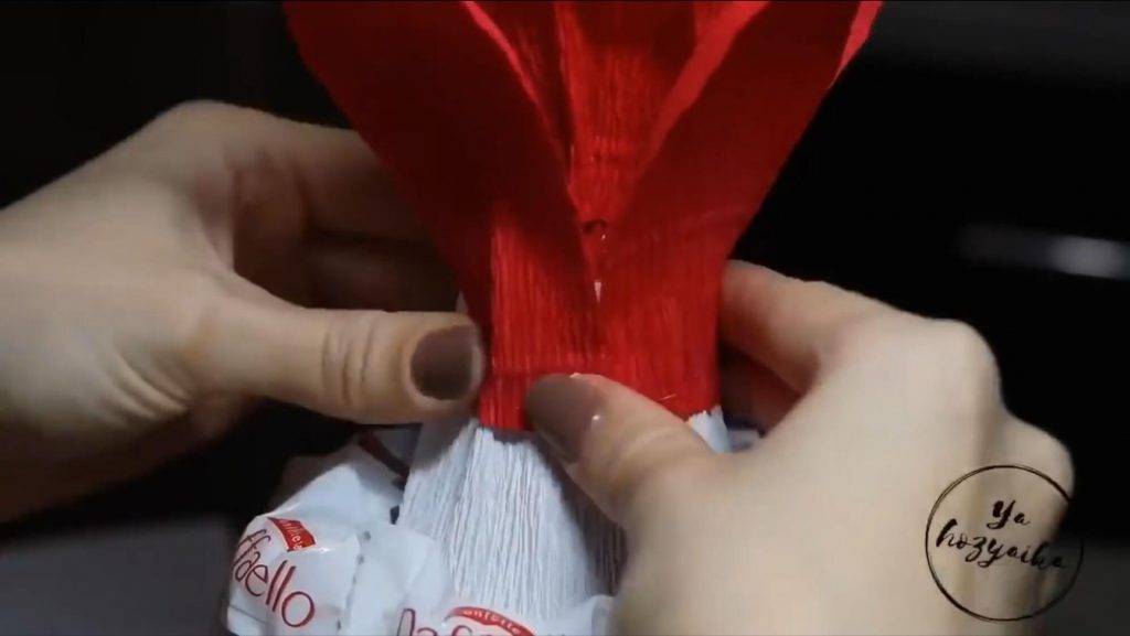 - Проткнуть конфету деревянной палочкой, низ бутона закрепить клеем из пистолета. Обмотать зеленым листом из пункта 3. Зафиксировать, прикрепить еще одну зеленную часть, сложив наискосок – маскировка всех креплений.