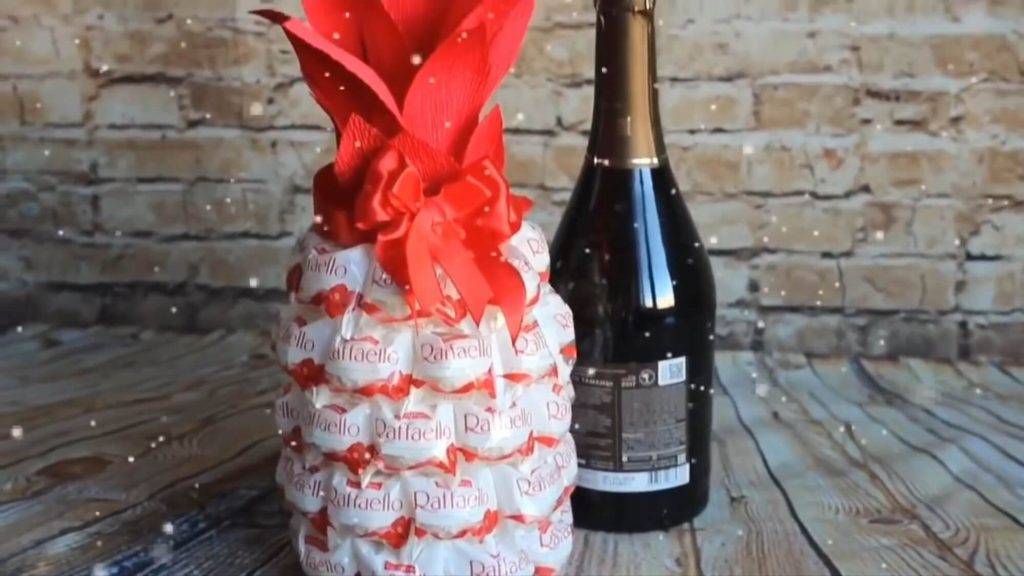 Простой и в то же время интересный вариант украшения – декор бутылок к празднику 8 марта своими руками конфетами Рафаэлло.
