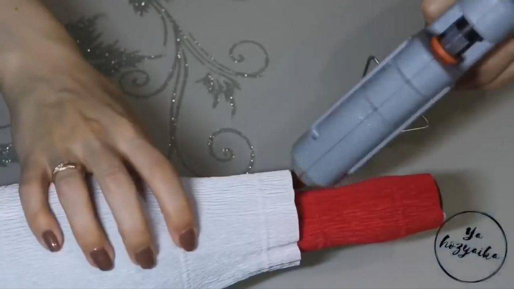 Затем берём красную гофрированную бумагу и вырезаем прямоугольник 11/9 см. Склеиваем его 9-ти сантиметровые боковые стороны. Это будет чехол для горлышка бутылки.
