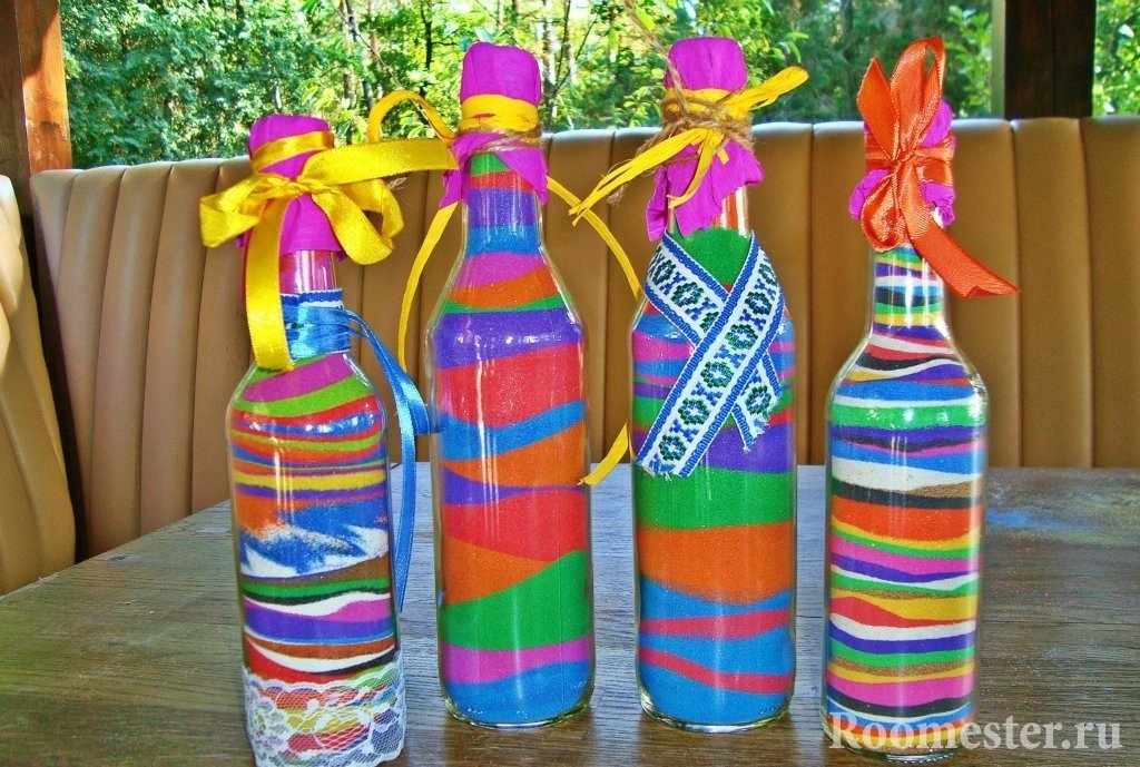 - Наполнение цветной солью. Внутрь бутылки постепенно засыпается соль или песок, окрашенные в разнообразные цвета. Во время этого бутылка наклоняется, благодаря чему появляются слои, создается разноуровневый узор и соль разных цветов не смешивается. Цветной песок довольно просто найти в магазинах, но и самому покрасить его не составит труда (в отличие от соли). К тому же собственноручное окрашивание позволит подобрать желаемый оттенок, в магазинах палитра цветов ограничивается четырьмя основными.
