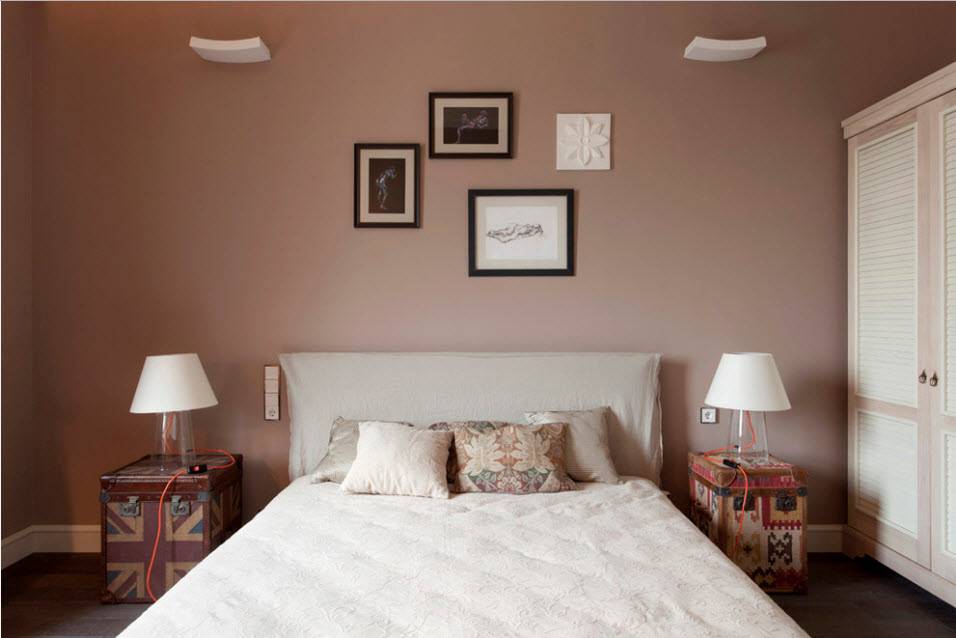 Помещения с богатыми фактурами и сложным цветовым оформлением не выдержат конкуренции со стороны выразительного фотоколлажа. Здесь чем проще фотодекор, тем лучше. Советуем разместить рамки в два ряда параллельных друг к другу и одинаковыми отступами.