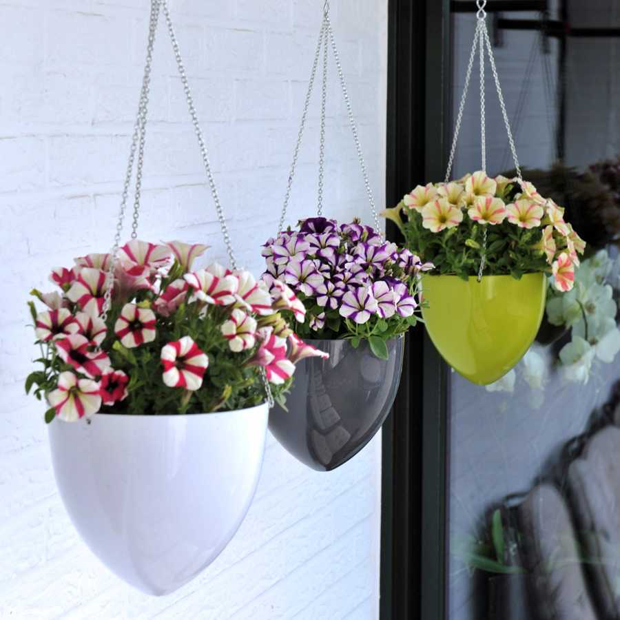 Для создания такого варианта используют контейнеры и горшки, которые имеют крепления для веревок и цепочек. А красиво оформить емкости помогут бегонии, петуньи и прочие свисающие растения.