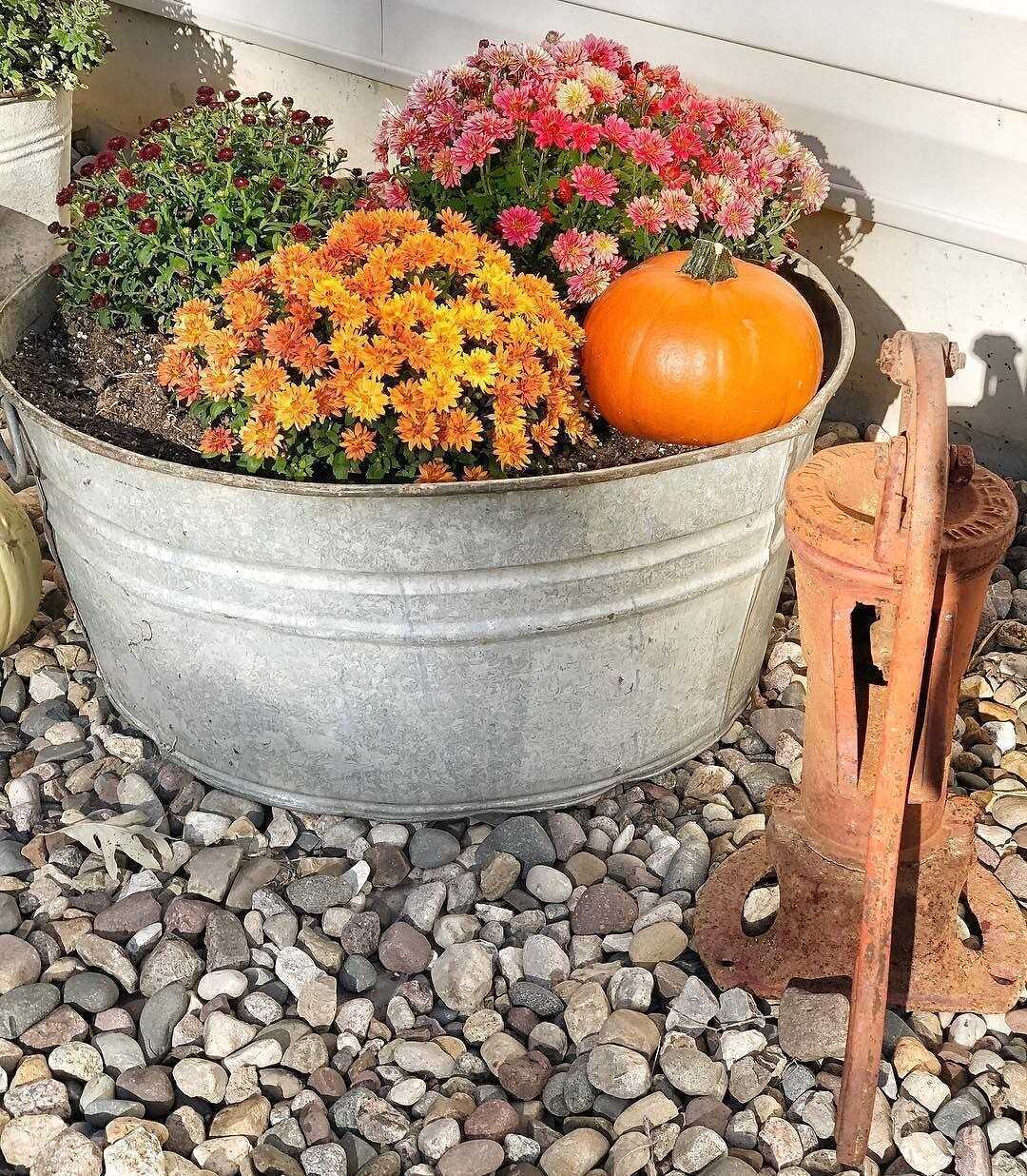 В ход идёт всё, что залежалось в старой кладовке. Весьма необычно и красиво смотрятся заржавевшие чайники, покрытые яркой эмалью, кастрюли, котелки из металла с эффектом легкой потертости. Некоторые дизайнеры усовершенствуют клумбы, обклеивая старую посуду разноцветными камешками и другими материалами.