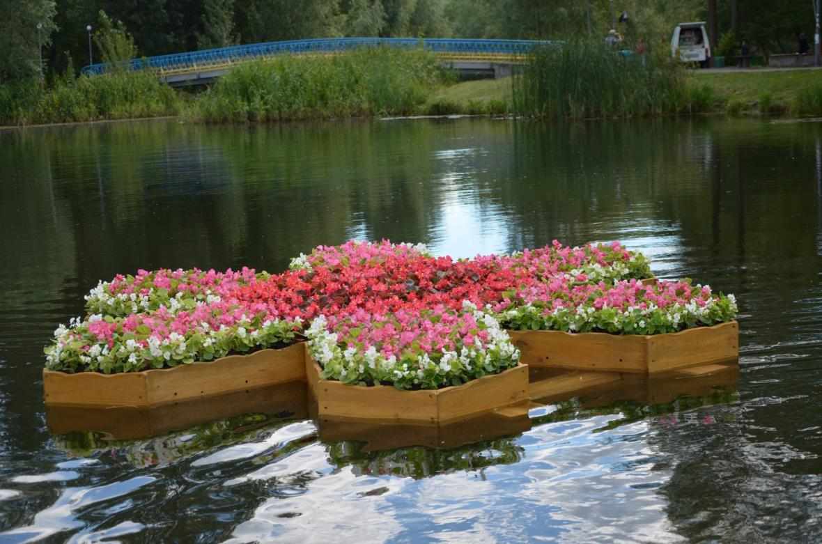 Очень стильно и красиво смотрится такой декоративный элемент водоема, как плавающая клумба. Зеленый островок из цветов можно соорудить своими руками. Достаточно сделать прочное деревянное основание с влагостойкой пропиткой, на которое помещается уплотняющая сетка и земля, и высадить на этот плот растения.