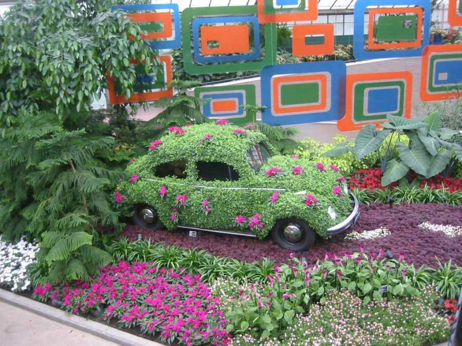 Нечто подобное можно проделать и со старым мотоциклом, особенно если у него есть коляска. Если же позволяет уровень мастерства, то фантастическим украшением станет каркасная фигура мотоциклиста, оформленная искусственной травой, дерном или цветами, имитирующими его одежду и шлем.