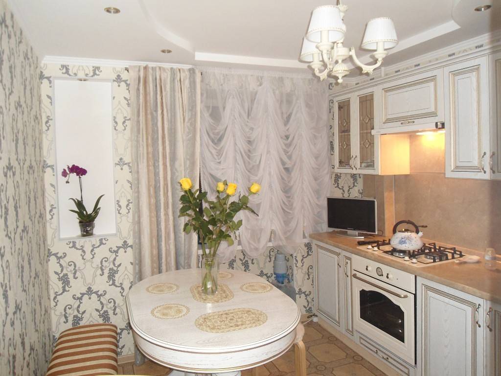 В отличие от спальни, которую прячут от любопытных глаз и утренних лучей солнца, кухня не нуждается в полном затемнении. Поэтому окна можно завесить ажурными гардинами