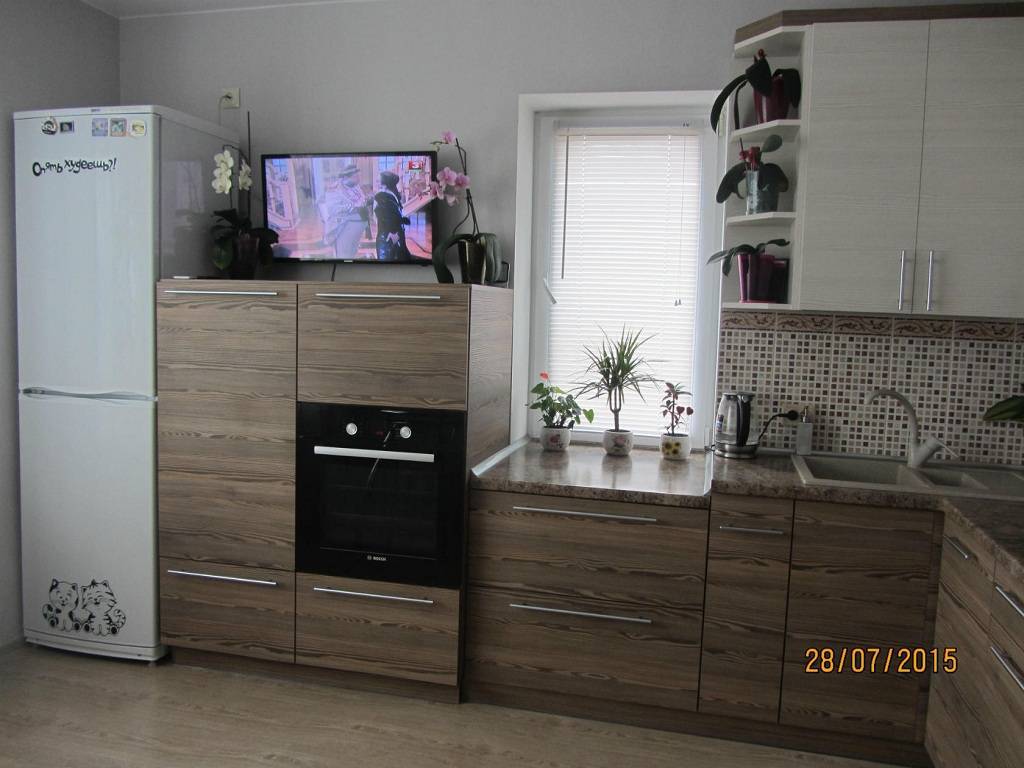 Короткие шторы для кухни являются, пожалуй, самым удобным и распространенным вариантом. Они легки в уходе, не мешают на тесном пространстве и не препятствуют частому открытию окна для проветривания.