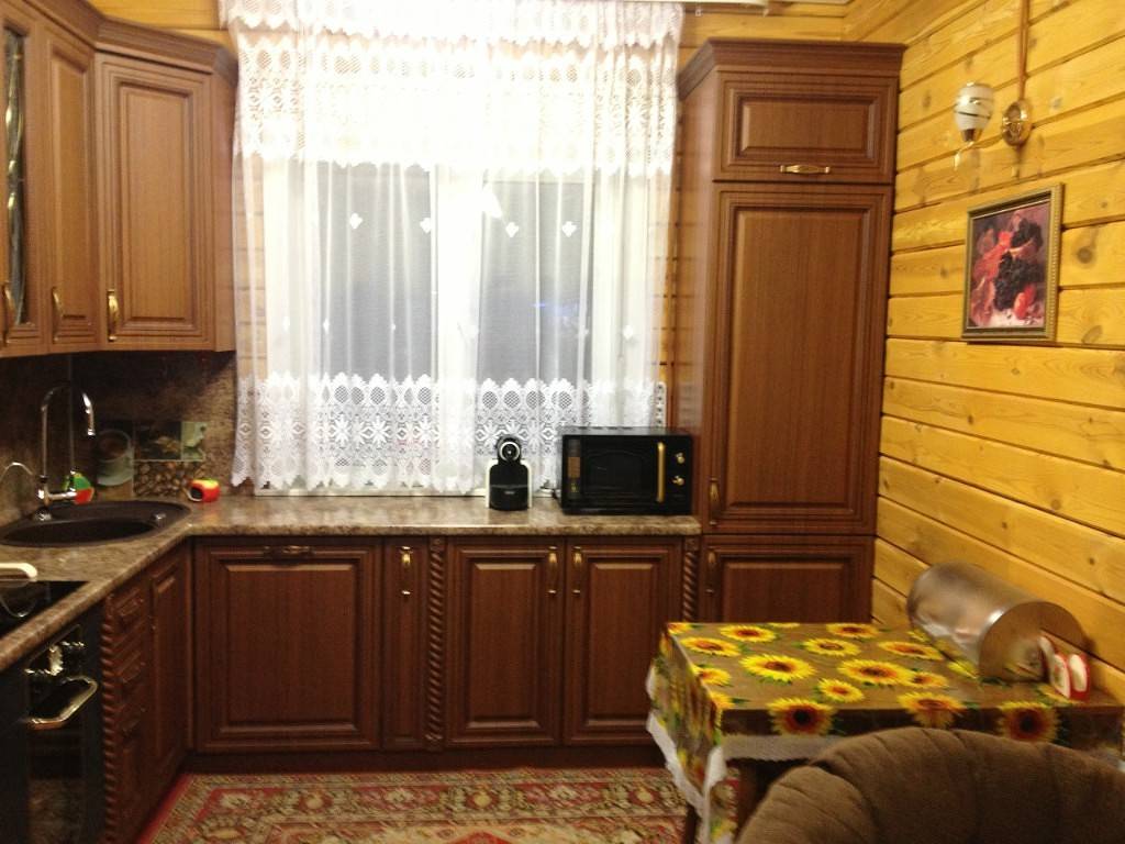 Бело-золотой цвет ламбрекена на кухонном окне подчеркивает натуральный цвет мебели из дерева Источник mydizajn.ru