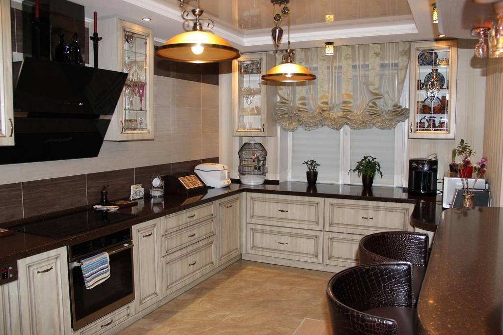 Размер и декор зависят от площади кухни. Помещение больше 15 м² можно украсить объемной драпировкой, а маленькие комнаты требуют минимального количества складок, воланов и дополнительных украшений.