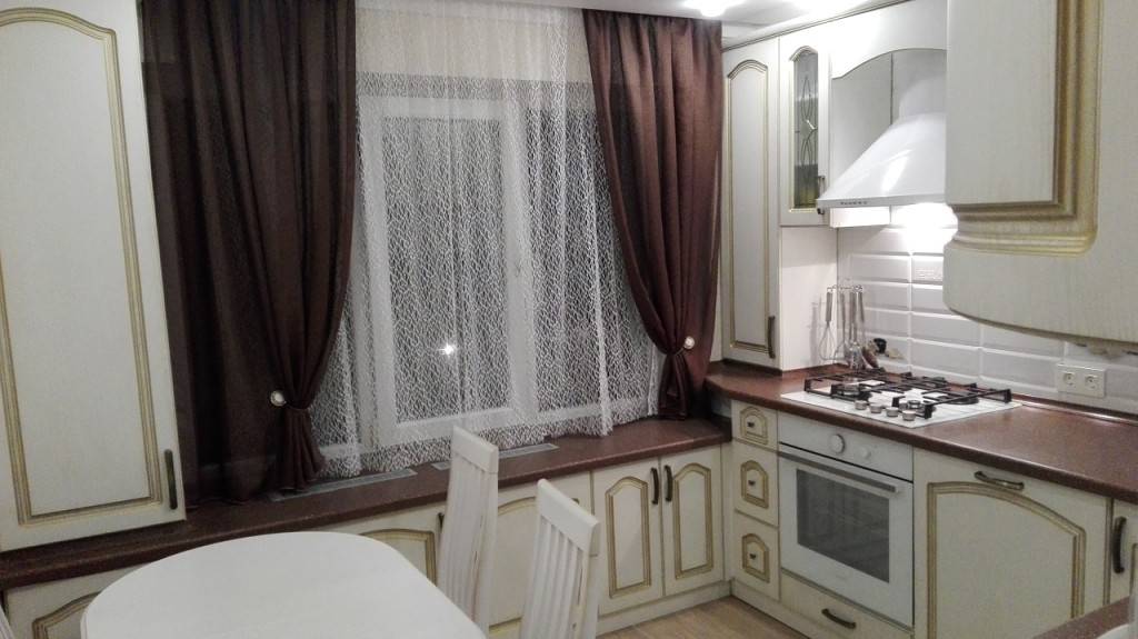 Ремарка: выбор штор на кухню с балконной дверью отличается — тут обычные длинные шторы в пол становятся рациональным выбором.