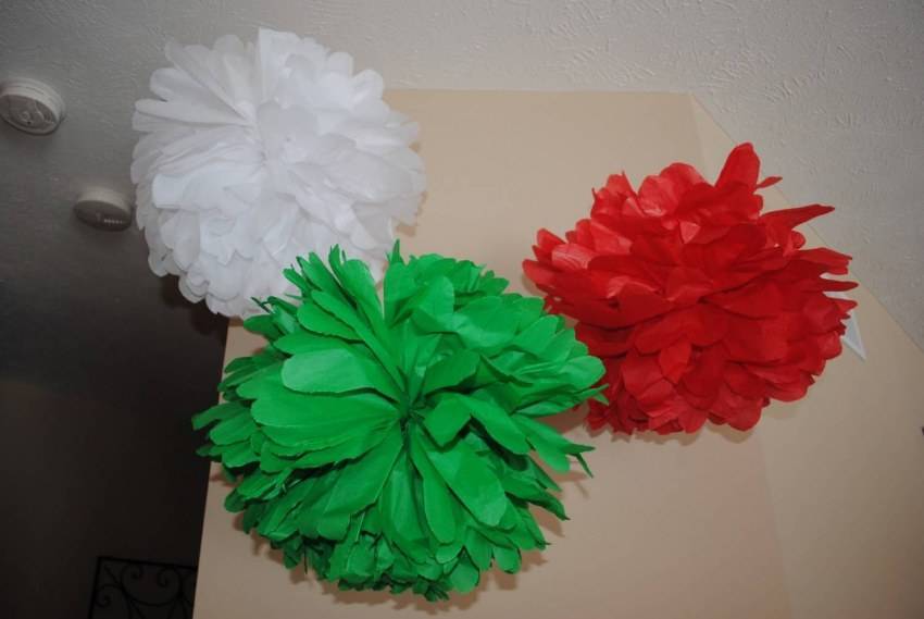 Помпоны или шары | Гофрированная бумага, ножницы, лента, нить или проволока, клей | Рулон, не разматывая, режут поперек, на три части. Получившуюся полоску складывают в гармошку. Посередине заготовку перевязывают лентой и расправляют все лепестки, и пушистый шар готов. Для красоты края цветка закругляют или заостряют ножницами. |