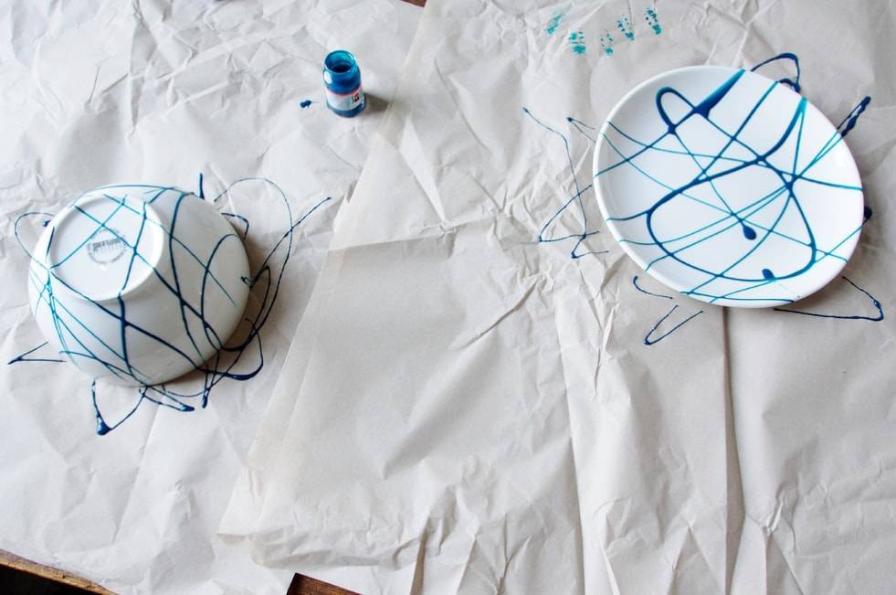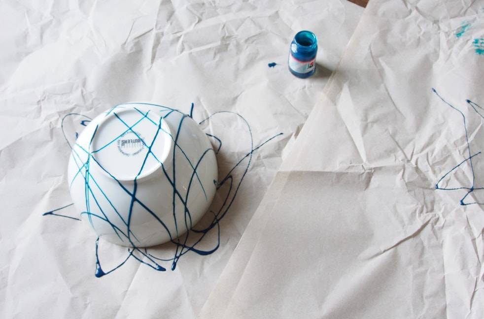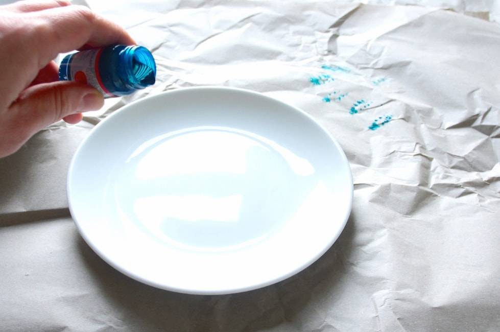 На бумагу кладем блюдце, после чего взбалтываем краску. Аккуратными движениями льем краску, чтобы получались полосы.