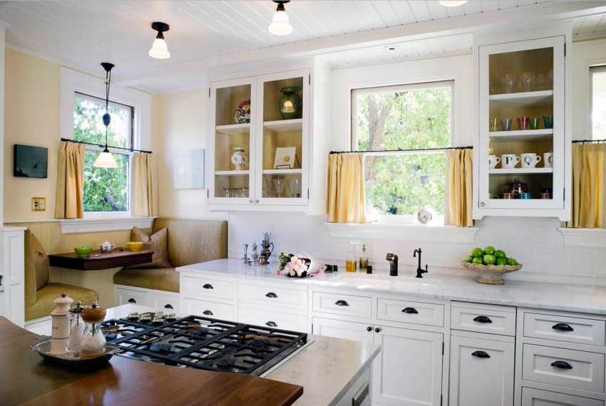 Закрытые наглухо шкафчики отнимают пространство на кухнях и без того малой площади. Исправить положение помогут открытые полки или замена фасадов дверцами с прозрачным стеклом. Такие создают впечатление большего объема помещения.