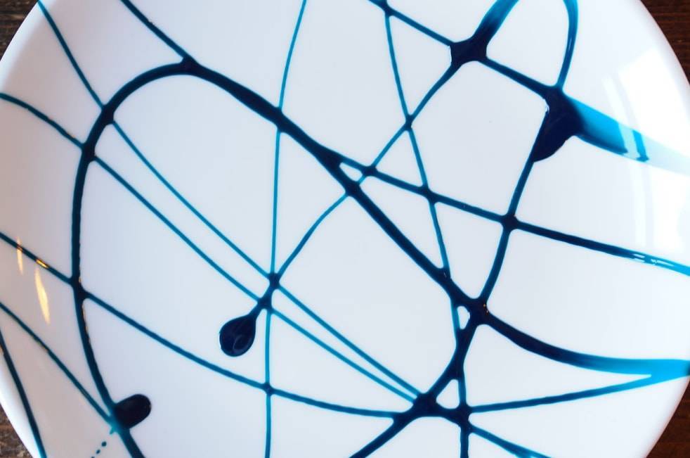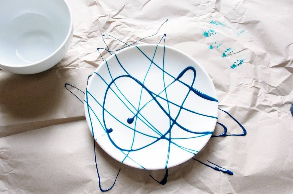 Снимаем бумагу, рисунок на тарелке у нас должен отпечататься. Выполняем рисунок. Затем тарелка будет сохнуть 24 часа – до полного высыхания. Декоративную посуду можно не запекать в духовке, а посуду, которую вы будете использовать для еды – запекают для стойкости красок. Посуду с акрилом – 15 минут, с витражными красками – 40 минут при температуре 150/180 градусов. Профессионалы пользуются вместо карандаша контуром для керамики, но так как мы – любители, то будем пользоваться карандашом или ручкой для нанесения рисунка.