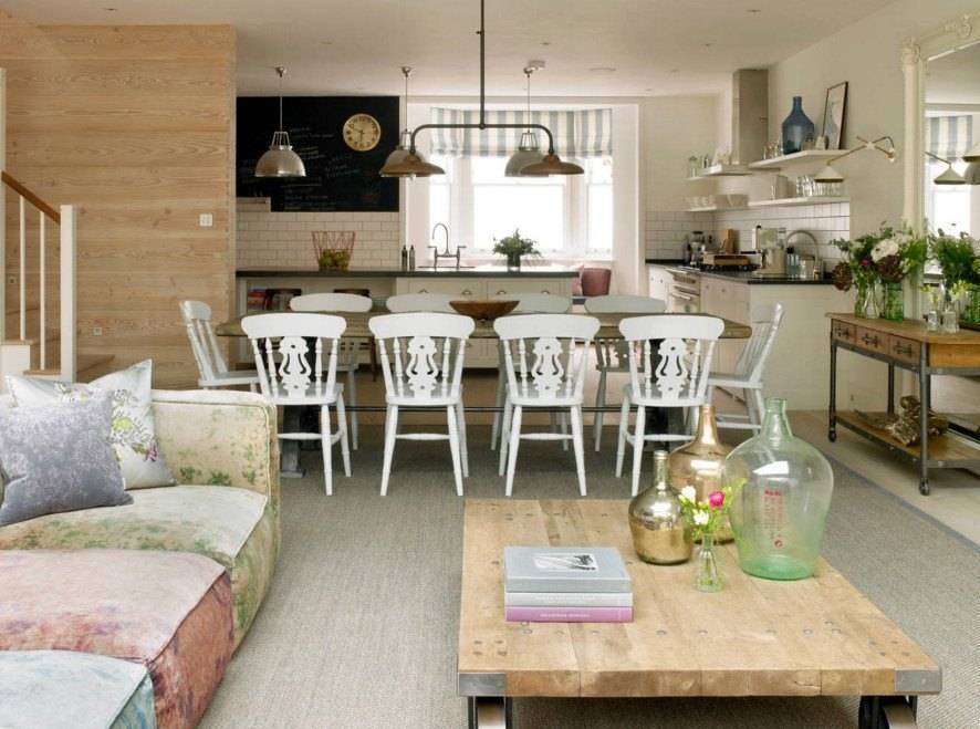 Стулья и шкафчики, обработанные одной краской, превращают элементы разрозненного гарнитура в одно целое.