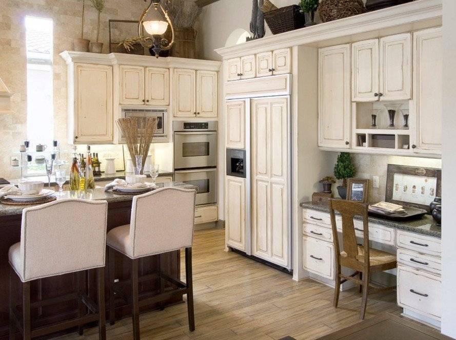 Покраска кухонной мебели может включать в себя декорирование «под старину»