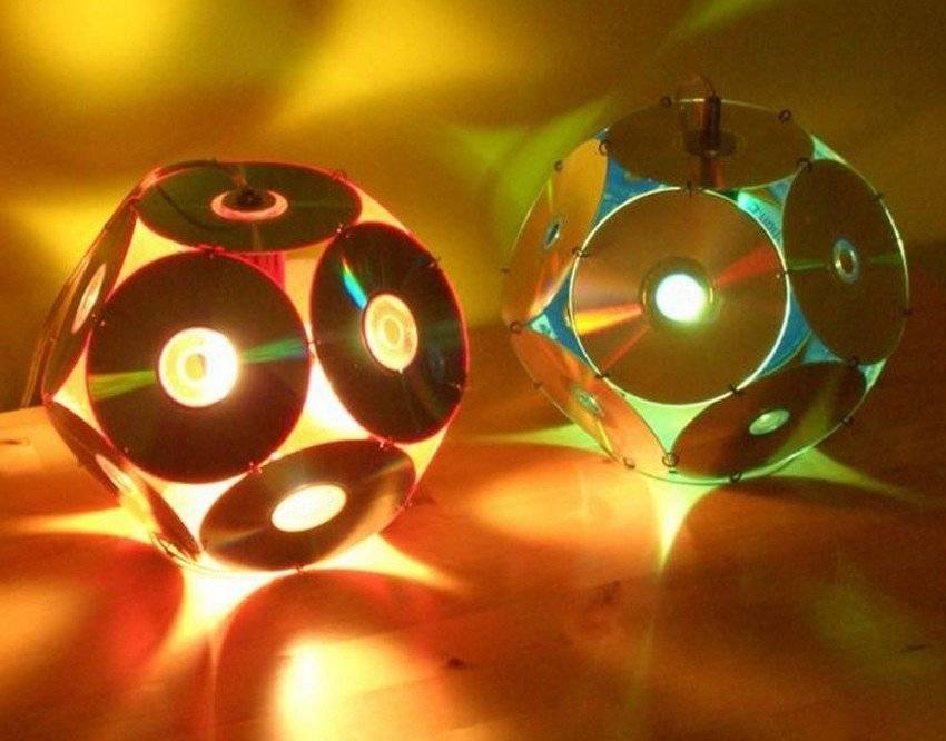 Можно сделать несколько видов таких светильников. Материалы, которые потребуются: резиновые ножки, силиконовые палочки, флуоресцентная лампа, круг из ДВП, CD-диски. Необходимы такие инструменты, как линейка-треугольник, карандаш, циркуль, клеевой пистолет, отвертка, плоскогубцы, клещи, дрель. В круглой форме из ДВП делается отверстие в самом центре, на ней рисуются двенадцать секторов. На линиях, которые их разделяют, сверлится по одному маленькому отверстию. Через них будут протянуты стальные провода, на каждом из которых разместится стопка из дисков. Конструкция получится достаточно тяжелой, поэтому нужны именно металлические провода. В отверстие в круге из ДВП засовывается провод с патроном, в него вставляется лампочка. Из дисков также можно сделать светильник-многогранник, плафон в виде шара, лепестков, светильник-кольцо.