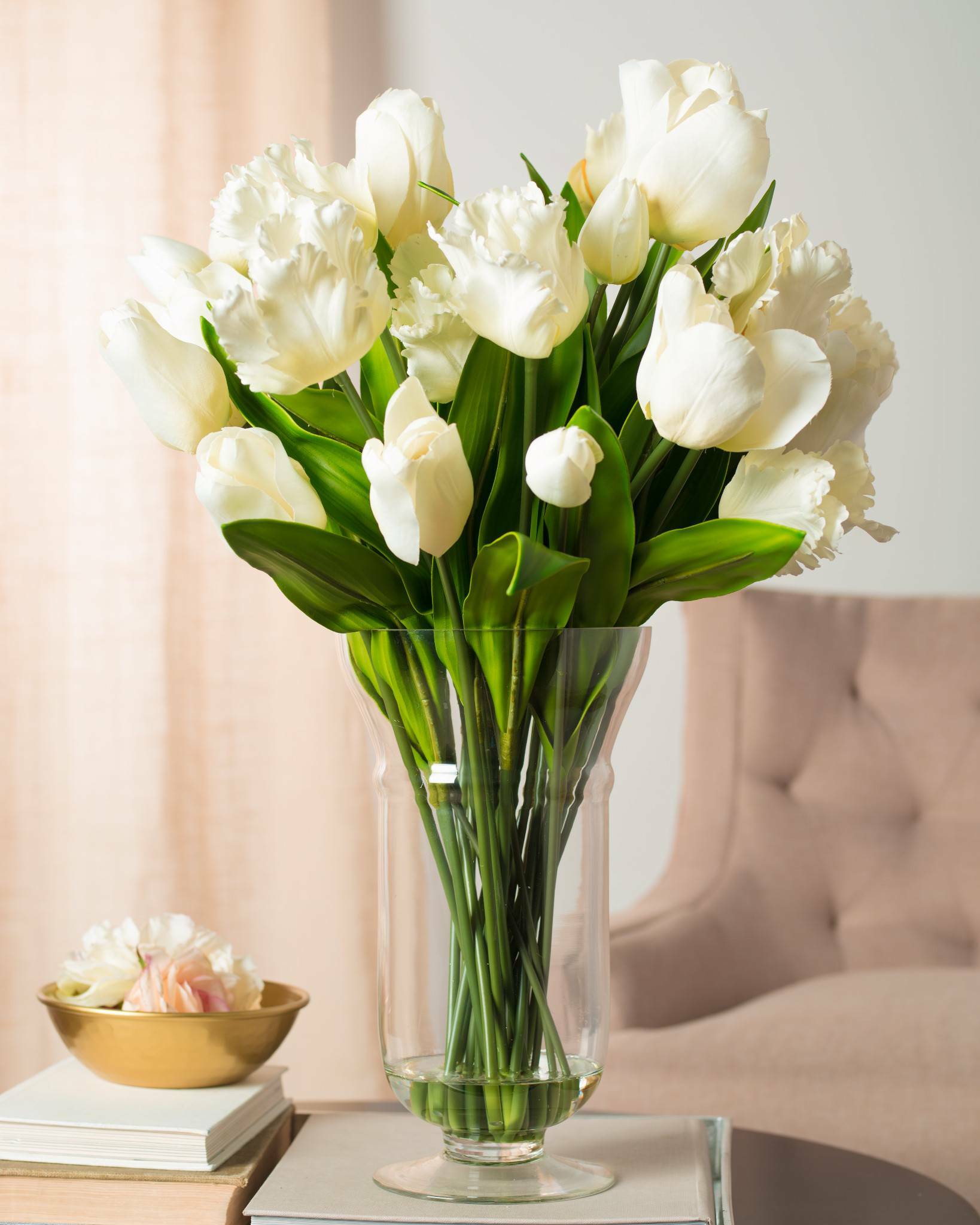 Цветы необязательно должны стоять в какой-либо емкости. Их можно просто положить на стол. Кроме того, вы можете сочетать несколько разных видов растений. Например, листья папоротника и бутоны роз.
